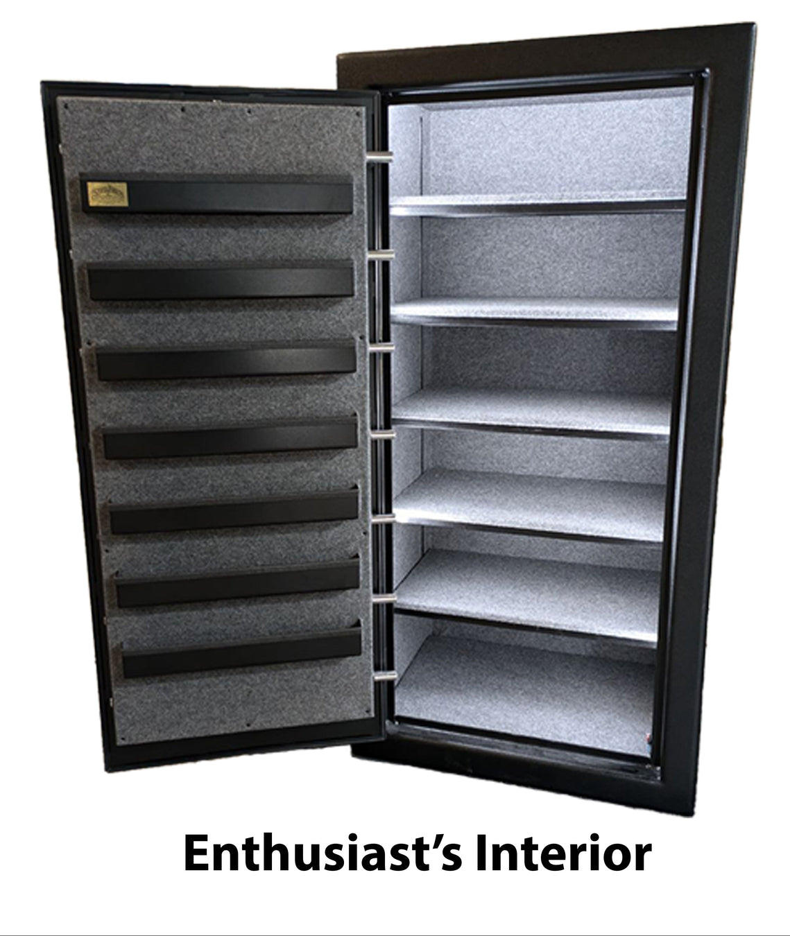 - Our Enthusiast's Interior is equipped with shelves from top to bottom. No gun racks are included. Either hooks or shelves can be included on the door. Whether you need a safe place for watches, jewelry, cash, passports, or other small valuables, the Enthusiast's Interior offers the perfect solution.